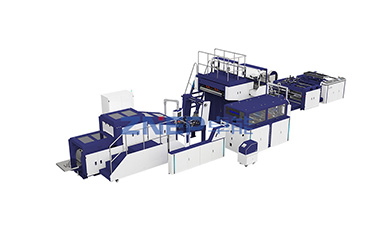 该机器用于生产带手挽加舌口的手提纸袋,由手挽工位将制好的圆绳和卷筒纸片自动做成手挽,通过输送系统将做好的手挽传送给切把、送把、贴把、压把的工位,然后将原色或印刷好的卷筒纸进行舌口的开窗吸废、涂胶贴纸、易撕线预刺、舌口位预刺、贴片避绳位点断、贴片位涂胶、自动粘贴手挽,再由主机将贴有手挽的纸张进行涂边胶、成筒、拉断、切断、压痕、底部涂胶、袋底成形并输送出袋,整个过程一次性同步完成。真正实现了全自动化生产,能够有效地节省人工成本。