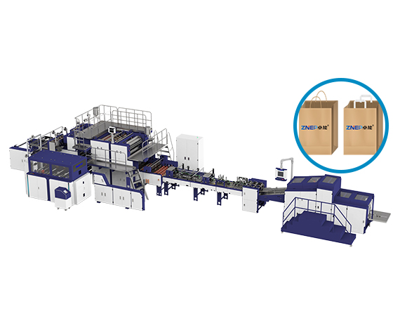 该机器用于生产内折口手提纸袋,由卷筒进纸进料,然后由手挽工位将制好的圆绳和卷筒纸片自动做成手挽,通过输送系统将做好的手挽传送给切把、送把、贴把、压把、内折的装置,然后将片张纸进行贴片位打口、贴片位涂胶、自动粘贴手挽。然后横切,将横切后的单张纸传送给内折机构,再由主机将贴有手挽的纸张进行涂边胶、压痕、成筒、底部涂胶、袋底成形并输送出袋,整个过程一次性同步完成。真正实现了全自动化生产,能够有效地节省人工成本。